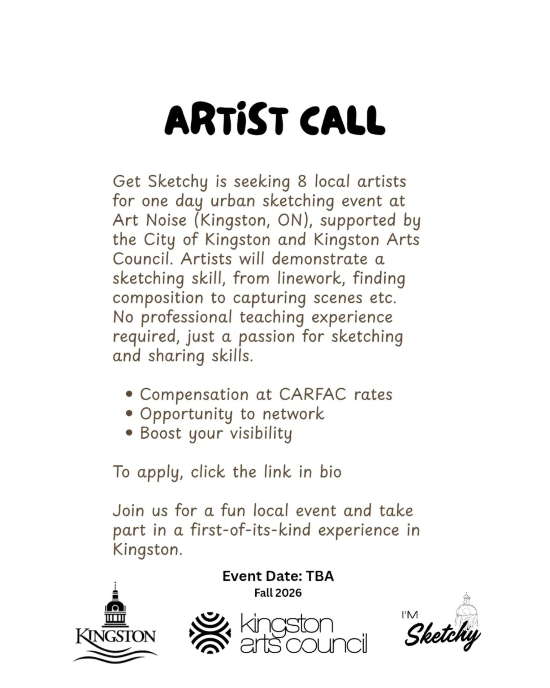 Get Sketchy: An Urban Sketch Carousel by Sumera Khan is a one-day, ticketed art experience designed to celebrate and promote the vibrant art form of urban sketching in Kingston. The event will take place at Art Noise and welcome up to 64 participants, ages 16 and up, who will rotate through a series of sketching “stations” led by eight professional artists.